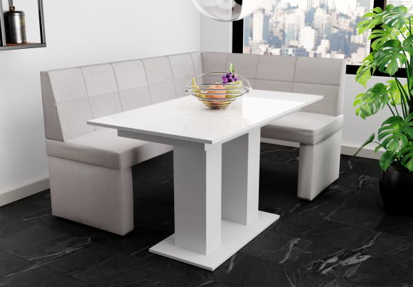 Eckbankgruppe 168×128 cm BLAKE L Stoff Soro Lichtgrau / Esstisch DANTE Weiß HGL