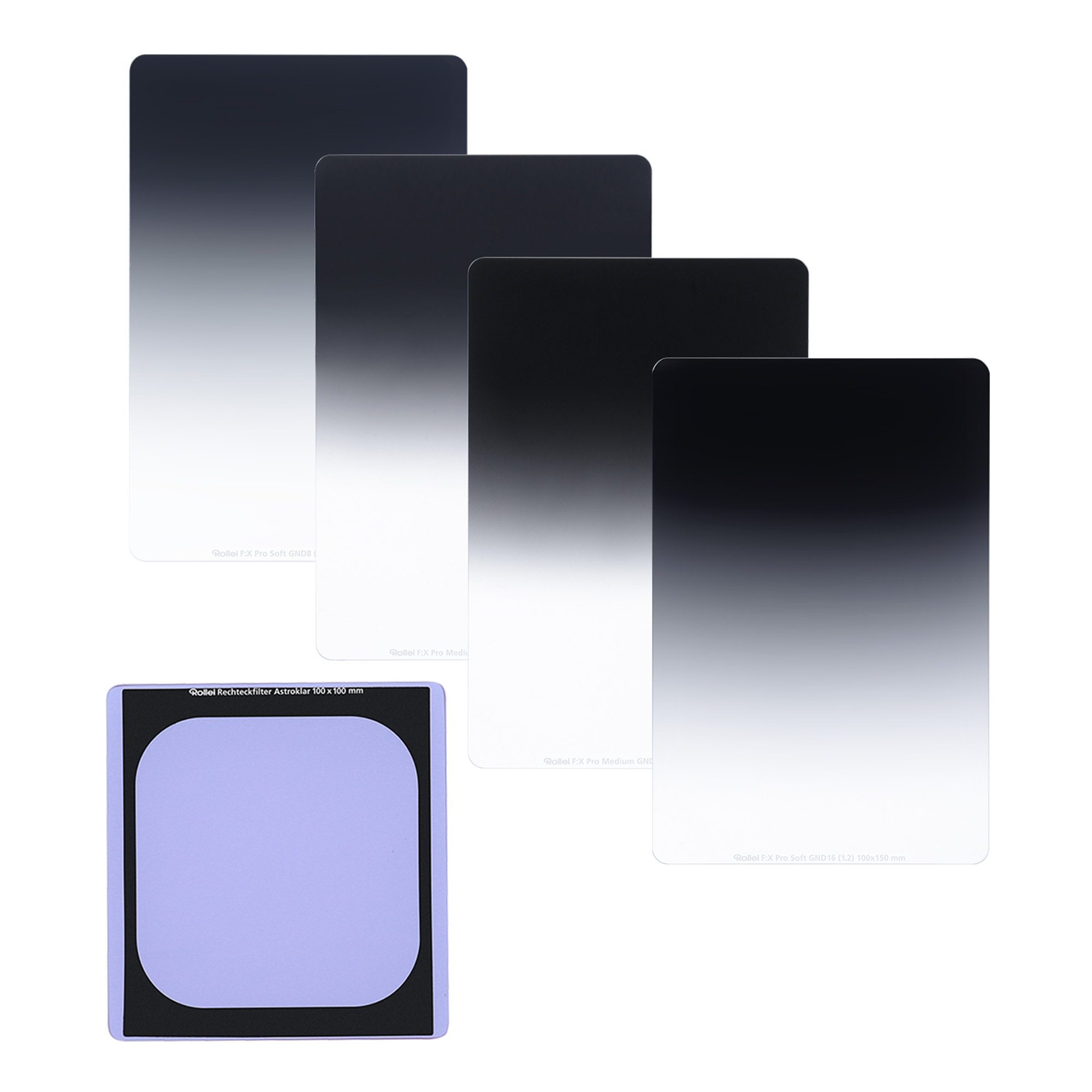 Es gibt viele Foto-Motive, bei denen unsere unterschiedlichen GND-Filter (Grauverlaufsfilter) zum Einsatz kommen können. Mit dem F:X Pro GND-Set + Astroklar Limited Edition bieten wir Ihnen ein Set, das besonders die Motive abdeckt, die einen unklaren Horizont aufweisen und damit den Einsatz von unseren Soft GNDs und Medium GNDs erfordern. Denn mit den im Set enthaltenen F:X Pro Soft GND8, Soft GND16, Medium GND8 und Medium GND16 können Sie ganz einfach genau den Rechteckfilter wählen, den Ihr Motiv benötigt. Zudem ist im Set unser 100 x 100 mm Astroklar-Filter enthalten, mit dem Sie Ihre Fotos bei Nacht auf das nächste Level heben können.
