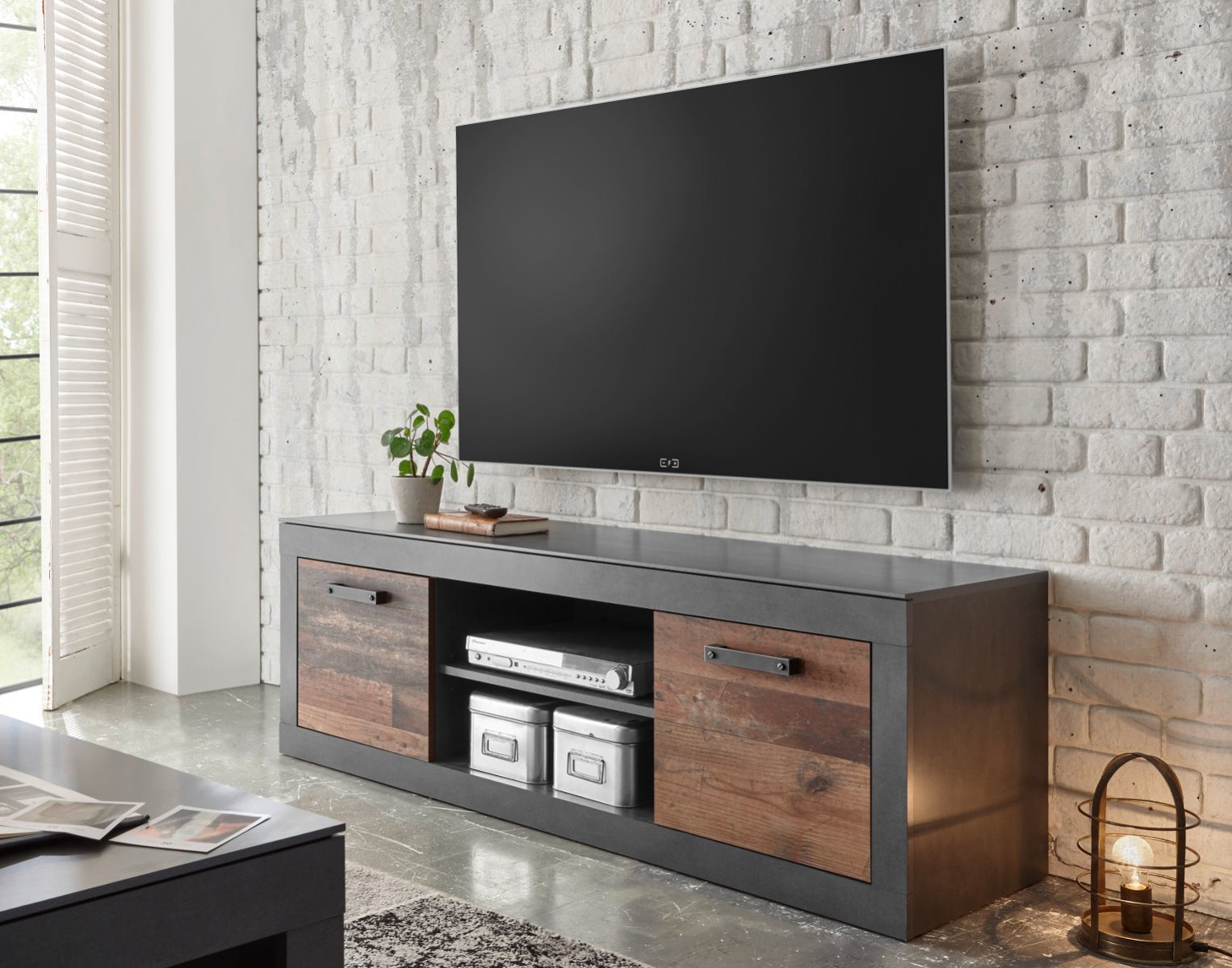 TV-Lowboard 153×51 cm 3-türigaus dem Programm QUEENSFront: Old Mix Dekor braun, used-lookKorpus & Applikation: Matera Dekor grauGriff: Metall-Optik used-look (aus Kunststoff)Außenmaße:Breite 153 cmHöhe 51 cmTiefe 43 cmMit 2x Türen und 2x Gerätefachern FSC®-zertifizierter HolzwerkstoffDas Lowboard wird im zerlegten und sicher verpackten Zustand versendet. Für die Montage sind detaillierte Aufbauanleitungen beigefügt. Die Möbelserie Queens beeindruckt mit extravagantem Mix aus Altholz Dekor in den Fronten und anthrazit matter Betonoptik am Korpus. Diese modernen Möbel verleihen jedem Raum außergewöhnlich frischen Stil. Metallgriffe in used-look betonen den industriellen Loft.Die Qualität und Verarbeitung entspricht den aktuellen Standards, die Oberflächen und Kanten sind sauber verarbeitet und es wurden Materialien aus nachhaltiger Forstwirtschaft verwendet. Türbeschläge und Schubkastenführungen sind aus Metall (jedoch ohne Dämpfung). Das Programm Queens besteht aus rund 20 Möbelstücken, mit welchen die Wohnbereiche Wohnzimmer, Flur und Schlafzimmer eingerichtet werden können. Aus dieser umfangreichen Typenvielfalt lässt sich fast immer eine passende Kombination für die eigenen vier Wände zusammenstellen. In unseren Angeboten stellen wir Ihnen einige attraktive Beispiel-Kombinationen vor, jedoch sind alle Möbel dieser Serie individuell kombinierbar. Überzeugen Sie sich selbst von der exzellenten Preis-Leistung dieser Möbel, bestellen online und lassen sich die Ware bequem nach Hause liefern.