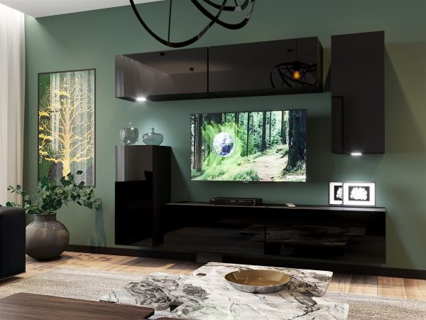 Mediawand Wohnwand 6 tlg – NEXI XL 38 – Schwarz Hochglanz inkl. LED