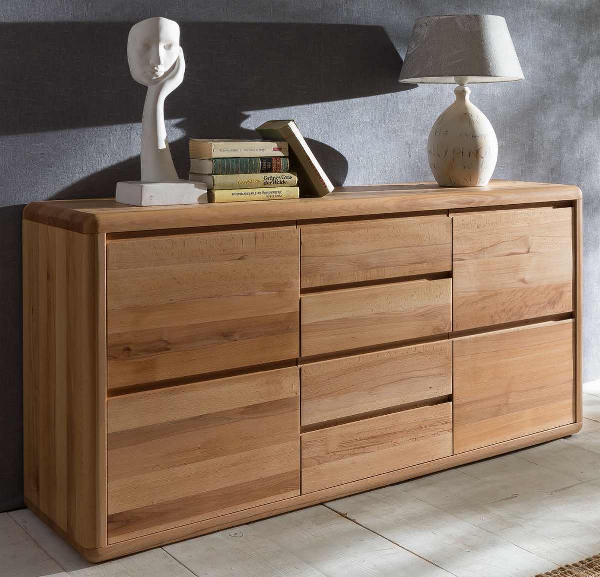 Sideboard mit 2 Türen und 3 SchubladenWildeiche teilmassiv geöltaus dem Programm TL3100Fronten: schwarzgrau lackiert, Absetzung Wildeiche massiv mit durchgehender Lammele, Oberfläche geöltKorpus:schwarzgrau lackiert, Absetzung Wildeiche furniert & geölt Rückwand sichtbar: Risseiche furniertRückwand hinter den Türen und Schubkästen: schwarzgrau dekorAußenmaße:Breite 180 cmHöhe 84 cmTiefe 44 cmMit 2 Holztüren und 3 Schubläden.Hinter den Türen befinden sich je 1 Fachböden.Schubkastenführung: Unterflurführung gedämpftfertig montierte Ware (außer Griffe / Füsse)TL3100– Wohnprogramm in schwarzgrau lackiert mit Wildeiche massivDieses Wohnprogramm ist die perfekte Wahl für alle, die ein modernes und stilvolles Zuhause schaffen möchten. Die Kombination aus schwarzgrau lackierter Oberfläche und Wildeiche massiv verleiht dem Möbelstück einen eleganten und zeitlosen Look.Qualitativ hochwertige Materialien und VerarbeitungDas Wohnprogramm besteht aus hochwertigen Materialien, die sorgfältig verarbeitet wurden. Die Oberfläche ist kratzfest und pflegeleicht. Die Absetzungen aus Wildeiche massiv sind robust und langlebig.Vielfältige KombinationsmöglichkeitenDas Wohnprogramm ist in einer Vielzahl von Einzelmöbeln erhältlich, die sich beliebig miteinander kombinieren lassen. So können Sie Ihr Wohnzimmer ganz nach Ihren individuellen Wünschen gestalten.PremiumausstattungDie Möbel sind mit einer Premiumausstattung ausgestattet, die den Komfort und die Funktionalität erhöht. Die Türen sind gedämpft und schließen sanft und leise. Die Schubkästen sind mit Unterflurführungen versehen, die ein einfaches und geräuschloses Öffnen und Schließen ermöglichen.Technische DatenMaterial: Qualitätsspanplatte mit Melaminharzbeschichtung, schwarzgrau lackiertAbsetzungen: Wildeiche massiv, geöltGriffe: Metall, schwarzgrau lackiertSchubkästen: Unterflurführungen, gedämpftTüren: gedämpftFüße: Metallkufen, schwarzgrau lackiertBeschläge und Scharniere: MetallHighlightsModernes Design mit MassivholzelementenHochwertige und aufwändig verarbeitete MaterialienLanglebig und widerstandsfähigVielfältige KombinationsmöglichkeitenPremiumausstattung mit gedämpften Türen und Schubkästen