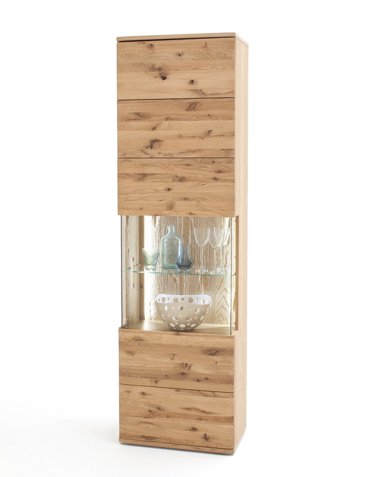 Vitrine mit Türanschlag Rechtsaus dem Programm Sante FeFronten: Asteiche Bianco massiv durchgehende Lamelle geöltKorpus außen: Eiche Bianco furniert geölt / innen: Eiche Bianco Dekor NachbildungRückwände hinter Glas: massiv strukturiert / Rückwände hinter Türen & SK: Eiche DekorFrontglas: parsol braunAußenmaße:Breite 60 cmHöhe 208 cmTiefe 37 cmMit 1x Holz-/Glastür.Hinter der Tür befinden sich 6 Fachböden (5x Holz, 1x Glas).Tür: gedämpftDie passende Beleuchtung Art. 026032ZB und 006090ZB können Sie separat dazu bestellen. Holzmöbel-Reihe Santa Fe – stabile Holzmöbel für mehr StauraumElegante Holzmöbel aus der Modellreihe Santa Fe können dank der Holzart Asteiche Bianco geölt ein natürlich helles Flair in jedes Wohnzimmer oder Esszimmer zaubern. Asteiche, auch Wildeiche genannt, ist ein besonders robustes Hartholz, das langlebig und sehr stabil ist. Asteiche ist der ideale Holzrohstoff, wenn man Massivholzmöbel mit qualitativ hochwertigem Furnierholzkorpus kombiniert.Hochwertige Verarbeitung, Holz als natürlicher Werkstoff und Glas von besonderer Qualität bilden den Grundstock für dieses Wohnprogramm.Mit den Modellen der Santa Fe-Linie hat man zeitlose Wohnklassiker aus Asteiche Bianco geschaffen. Die ansprechende und elegante Optik schafft es hier in Kombination mit handwerklich strukturierten Rückwänden und den Blick freigebenden Glaselementen zu begeistern. Die Struktur der Rückwände kommt besonders gut zum Vorschein, wenn die optional bestellbare Spezial-Beleuchtung verwendet wird. Diese beleuchtet die Rückwand seitlich, wodurch die Natürlichkeit der Oberfläche stärker betont wird und die edle Optik hervorhebt.Die Holzmöbel Santa Fe bieten neben ihrer natürlichen Holzoptik und der damit verbundenen dekorativen Komponenten auch jede Menge sichtbaren wie auch verborgenen Stauraum. So hat man die Wahl, auf den Möbeln und den teilweise inkludierten offenen Regalen Dekorationsartikel oder auch Praktisches zu platzieren, oder die geölten Holzoberflächen ohne Bedeckung wirken zu lassen. Die Schubkästen auf einer Unterflurführung bieten reichlich Platz für die kleinen und etwas größeren Dinge des Alltags. Die Griffe der Türen und der Schubladen sind aus Metall und die Türscharniere sind ebenfalls gedämpft. Sämtliche Glaselemente sind aus gehärtetem Klarglas. Besonders elegant und behaglich wirkt das leicht abgedunkelte Glas der Vitrinenschränke.Holzmöbel Santa Fe – große AuswahlSie können ein harmonisches und durch die Holzmöbel perfekt aufeinander abgestimmtes Zimmer erstellen, da die Linie Santa Fe Ihnen dafür viele Möbelmöglichkeiten an die Hand gibt. So finden Sie hier für den Bereich Wohnen Wohnwände, Sideboards Vitrinen und Couchtisch, sowie verschiedene Highboards und einen ausziehbaren Esstisch fürs Esszimmer.
