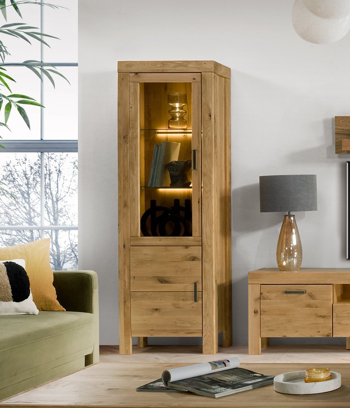 Bereichern Sie Ihr Zuhause mit unserem eleganten zweitürigen Vitrinenschrank aus teilmassiver Eiche, der Funktionalität und zeitlose Schönheit vereint. Dieser Vitrinenschrank bietet nicht nur ausreichend Stauraum für Ihre kostbaren Gegenstände, sondern dient auch als stilvolles Möbelstück, das Ihre Einrichtung perfekt ergänzt.